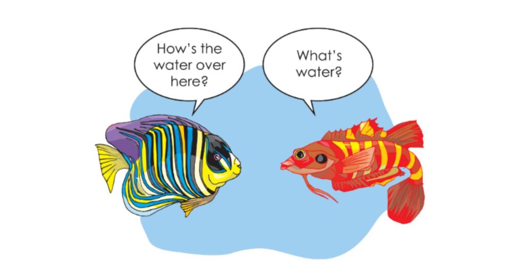 Pour chacun de nous, la culture peut être comparée à l’eau dans laquelle les poissons nagent. Ceci est illustré par le dessin ci-dessous : un poisson nage vers un autre poisson, dans une autre partie de l’océan, et demande « Comment est l’eau ici ? » Le deuxième poisson répond : « C’est quoi l’eau ? » En d’autres termes, la culture est quelque chose dont nous ne sommes peut-être pas conscients alors même que nous y sommes plongés, et qu’elle a une influence sur tout ce qui nous concerne.
